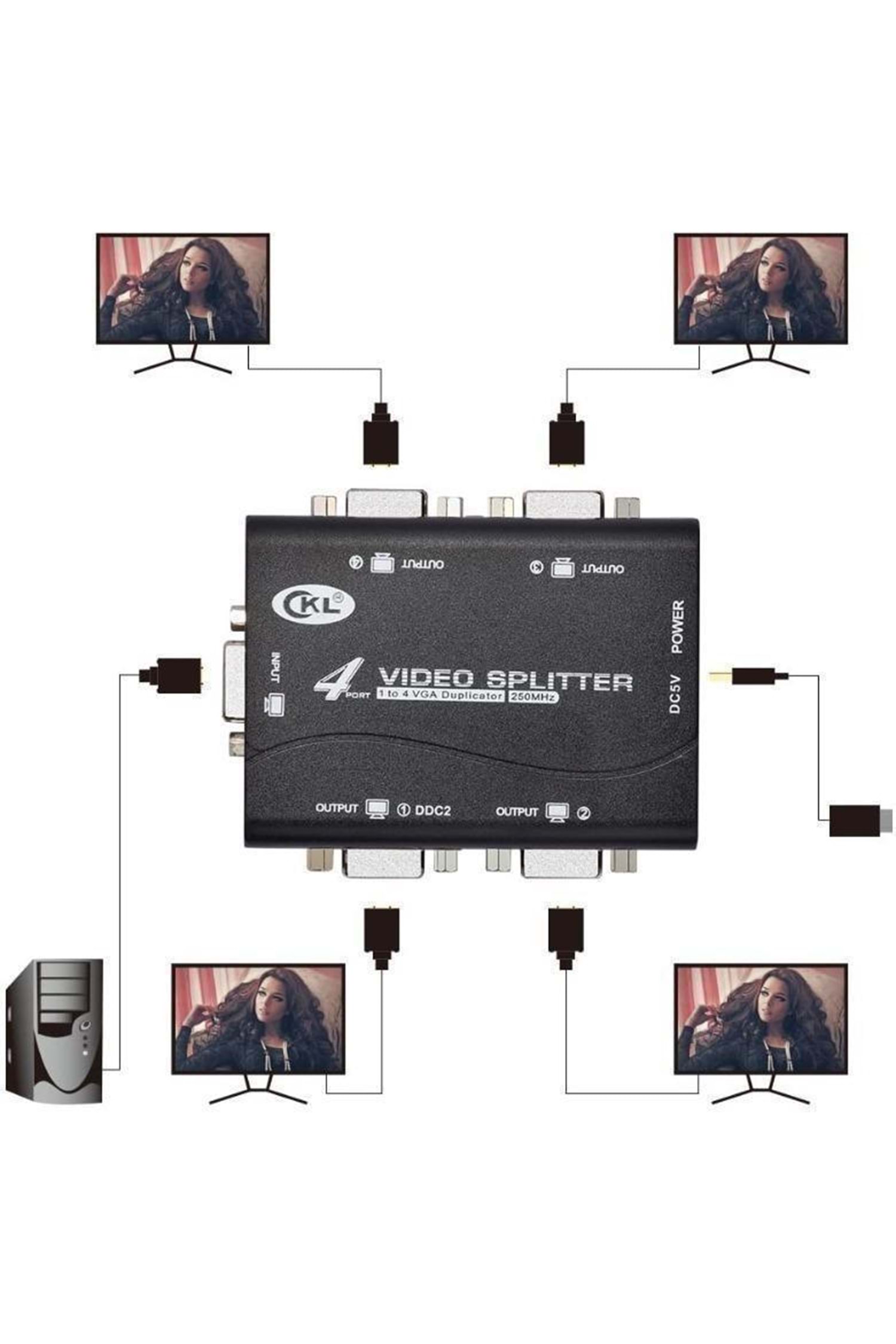 · 1 VGA GİRİŞİ, 4 VGA ÇIKIŞI. 250 MHz video bant genişliğini destekler. Bu VGA Ayırıcı, PC ekranını genişletmek için değil, video veya görüntü çoğaltmak içindir.