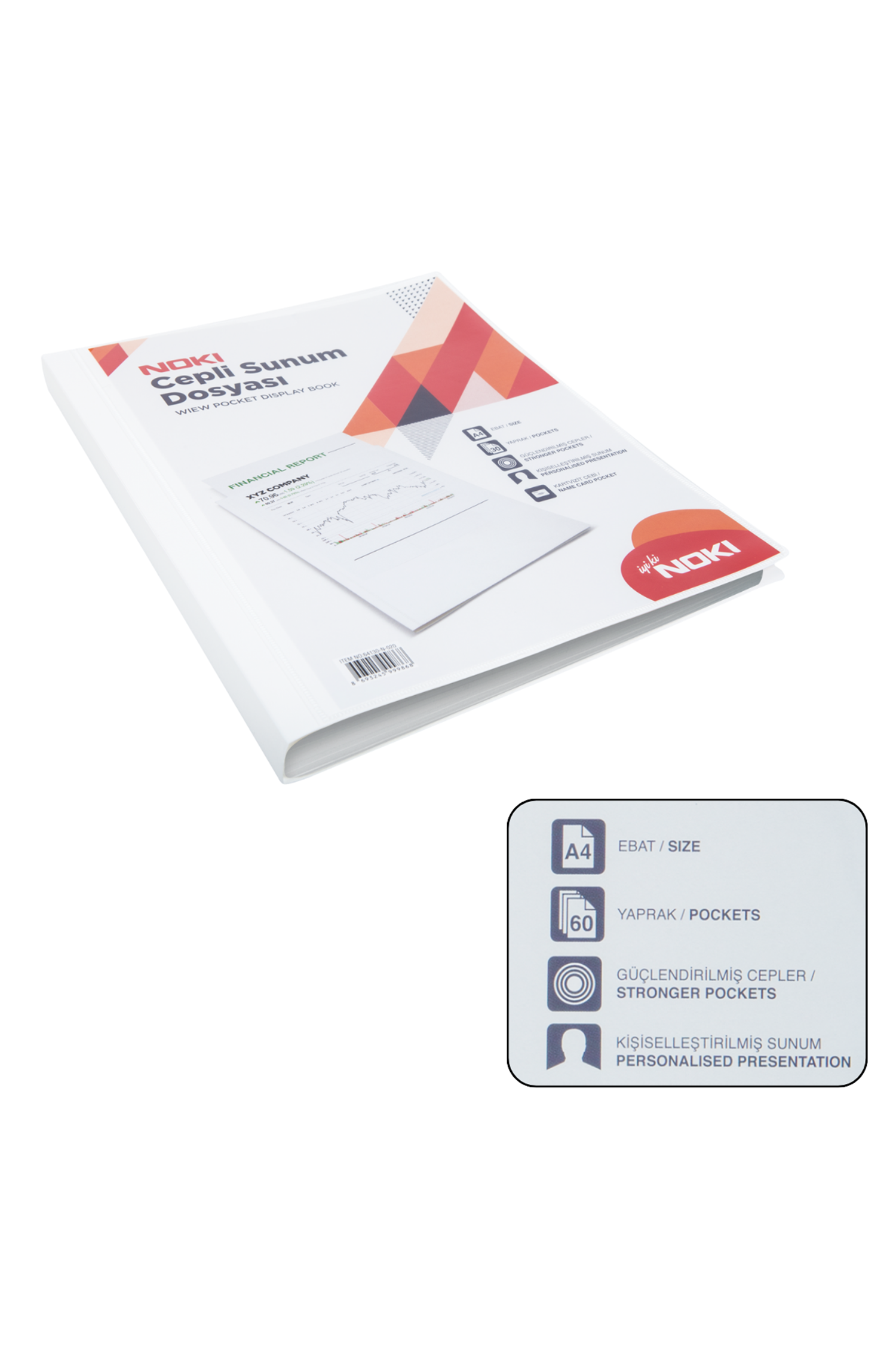 Pratik kullanım için ideal bir sunum dosyası, 60 yaprak kapasitesiyle belgelerinizi düzenlemeye yardımcı olur. Ön cepli tasarımı sayesinde kartvizit ve CD-DVD'lerinizi saklamaya yardımcı olur.